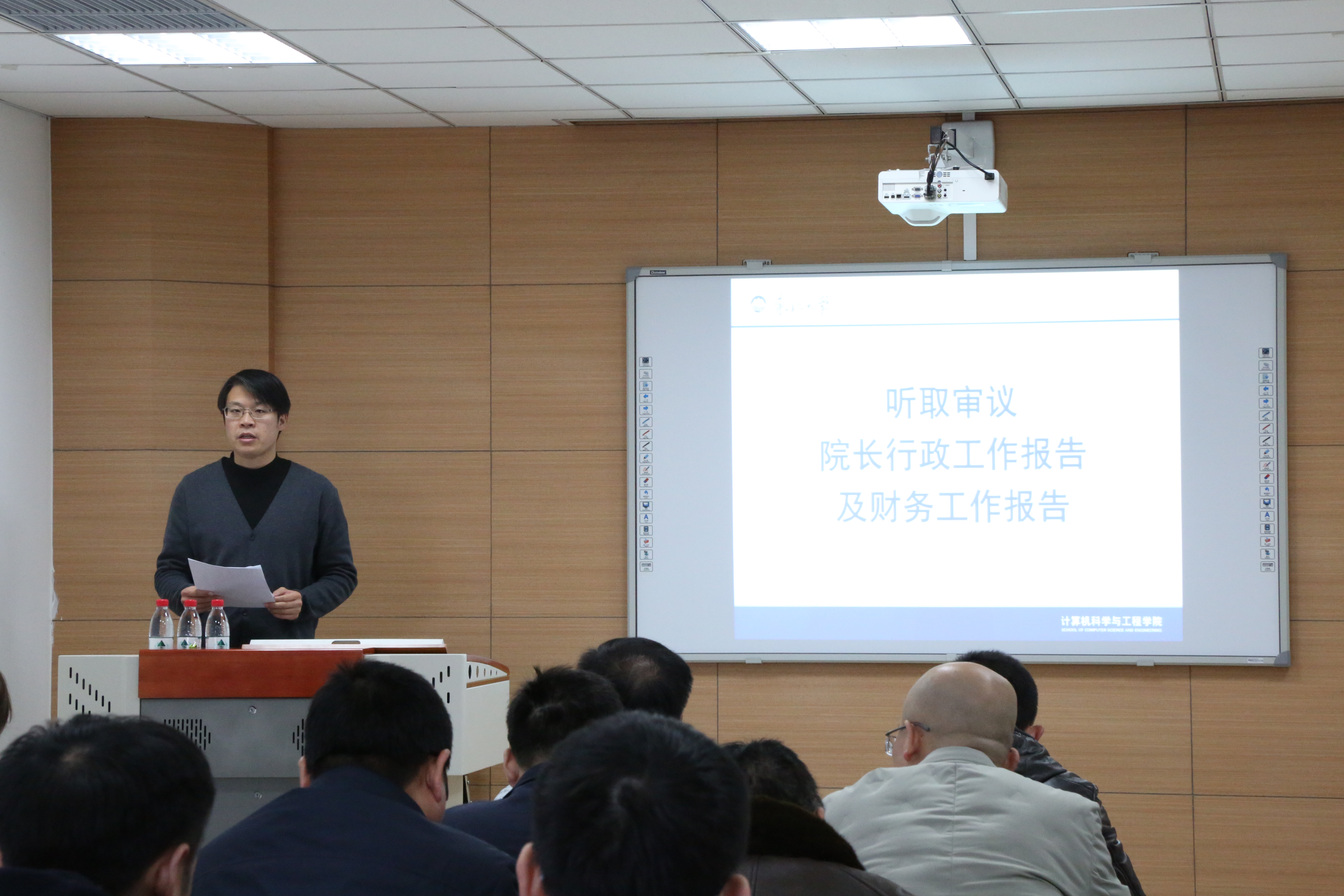 学院常务副院长杨金柱做学院行政工作报告及财务工作报告。杨金柱介绍了学院一年多以来在“双一流”建设、学科科研、人才培养、师资队伍建设、学生培养、国际合作及产学研等工作中取得的丰硕成果,并通报了学院创收经费、教学经费、学生活动费等的拨款和使用情况。