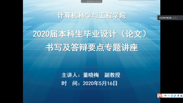 5月16日上午,学院邀请董晓梅副教授为2020届本科毕业生做《毕业设计论文写作规范及答辩要点》专题讲座,讲座采用腾讯会议进行,学院教学副院长鲍玉斌出席并讲话,全院300名毕业生参会。