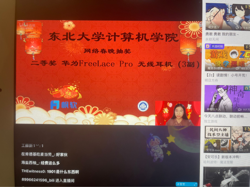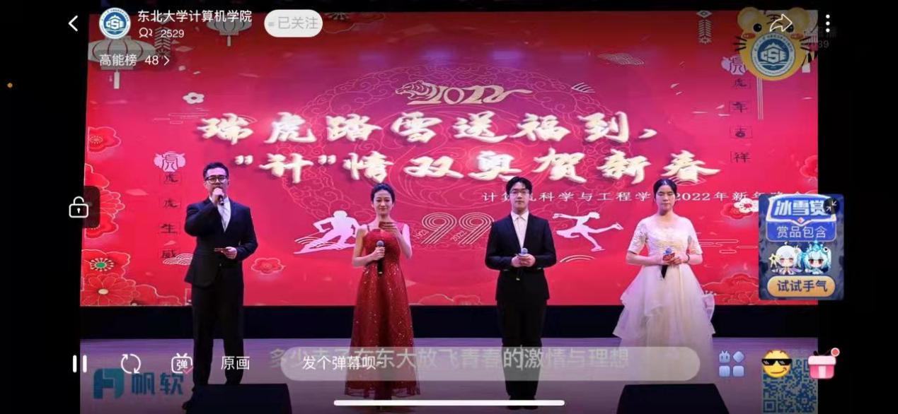 2022年1月29日19:30—22:00,我院“瑞虎踏雪送福到,‘计’情双奥贺新春”2022年网络春晚顺利举行,网络春晚通过哔哩哔哩平台“东北大学计算机学院”官方账号进行直播,我院师生、教职工、家长等在线观看,最高观看人数达1.1万人,晚会深受大家的欢迎与喜爱。