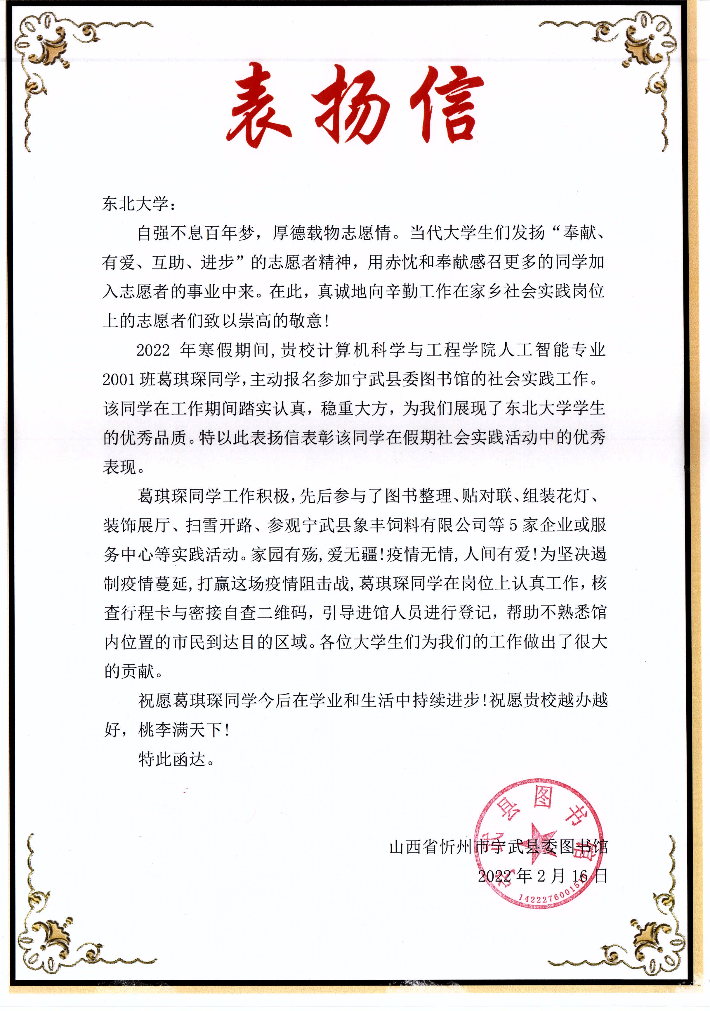 信中表示,葛琪琛同学作为图书档案管理员,工作积极认真,先后参与了图书整理、贴对联、组装花灯、装饰展厅、扫雪开路、参观宁武县象丰饲料有限公司等5家企业或服务中心等实践活动;为打赢疫情阻击战,积极参与图书馆疫情防控志愿服务,为图书馆的各项工作作出了很大的贡献,展现了东北大学学生的优秀品质与责任担当。