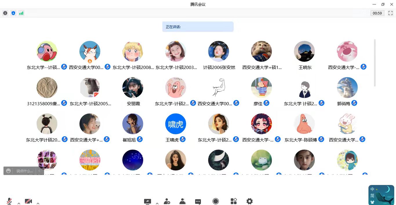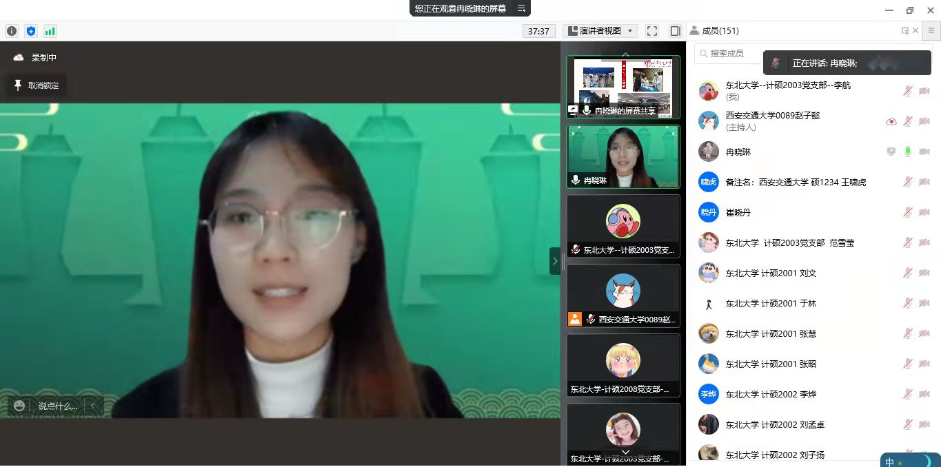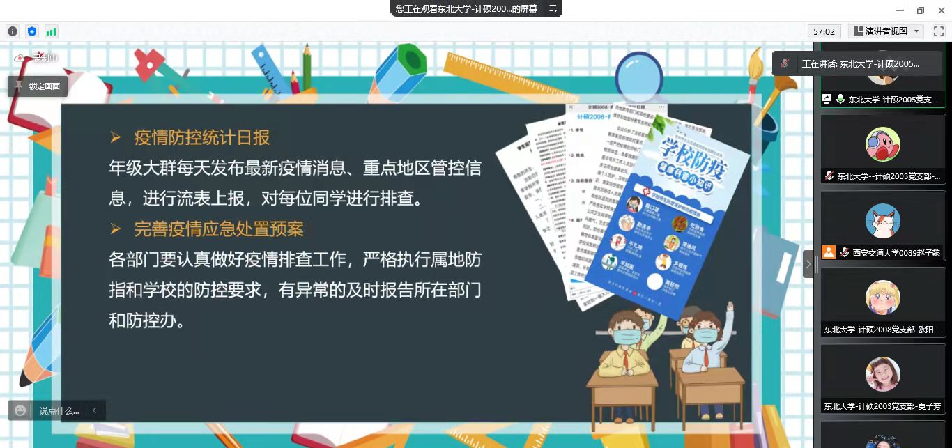 我院计硕2003党支部书记李航同志、2005党支部书记任莲妹同志、2007党支部书记张薇同志、2009党支部书记崔旭旭同志等相继介绍我校基层党支部在抗击疫情中的特色做法。硕士2005党支部任莲妹向大家介绍了新冠疫情的相关科普知识以及本轮疫情发生后学校和学院所采取的部分举措,学校及时发布疫情防控工作方案,各部门协调合作,完善疫情防控统计日报,通过网格化管理体系对每名同学情况进行精准统计,做到不落下任何一名学生,不留一点隐患;学院针对校园封闭管理期间线上教学的特点,建立线上党员“红色1+1”学业帮扶机制,保障同学们“线上学习”不掉队。同时开展“战疫青春不迷茫”抖音生活分享比赛等活动,发布同学们校园封闭管理期间的学习生活,宣传、营造积极乐观的生活学习态度。2003党支部李航与2007党支部张薇共同分享了学院《致全院学生党员做好疫情防控工作的倡议书》,并向两所学校的党员同学们提出了疫情期间的倡议和要求,希望大家发挥党员先锋模范作用,为身边同学做好表率。最后硕士2009党支部崔旭旭和大家一起分享了东北大学以及计算机学院的光辉历史、校园风光,并展示了党员同学们亲手制作的美育作品。