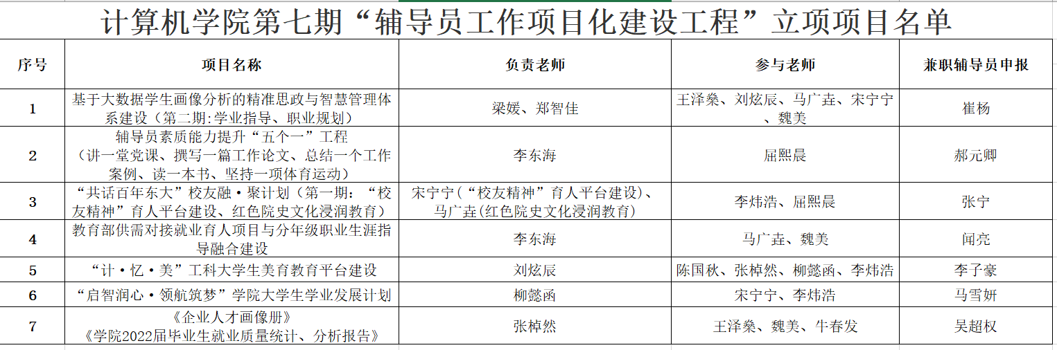 据悉,我院《十年躬耕,思行并进:依托“辅导员工作项目化”为高校辅导员职业能力提升聚势赋能》辅导员队伍建设的工作案例,近日喜获2021年度全国高校思想政治工作优秀案例一等奖。经过前期自主申报、论证,本次第七期“辅导员工作项目化建设工程”共有7个项目立项,学院将持续发挥此项工作的育人效能,促进辅导员综合素质提升,助力学院一流人才培养、一流学科建设,推动学院学生工作再上新台阶。