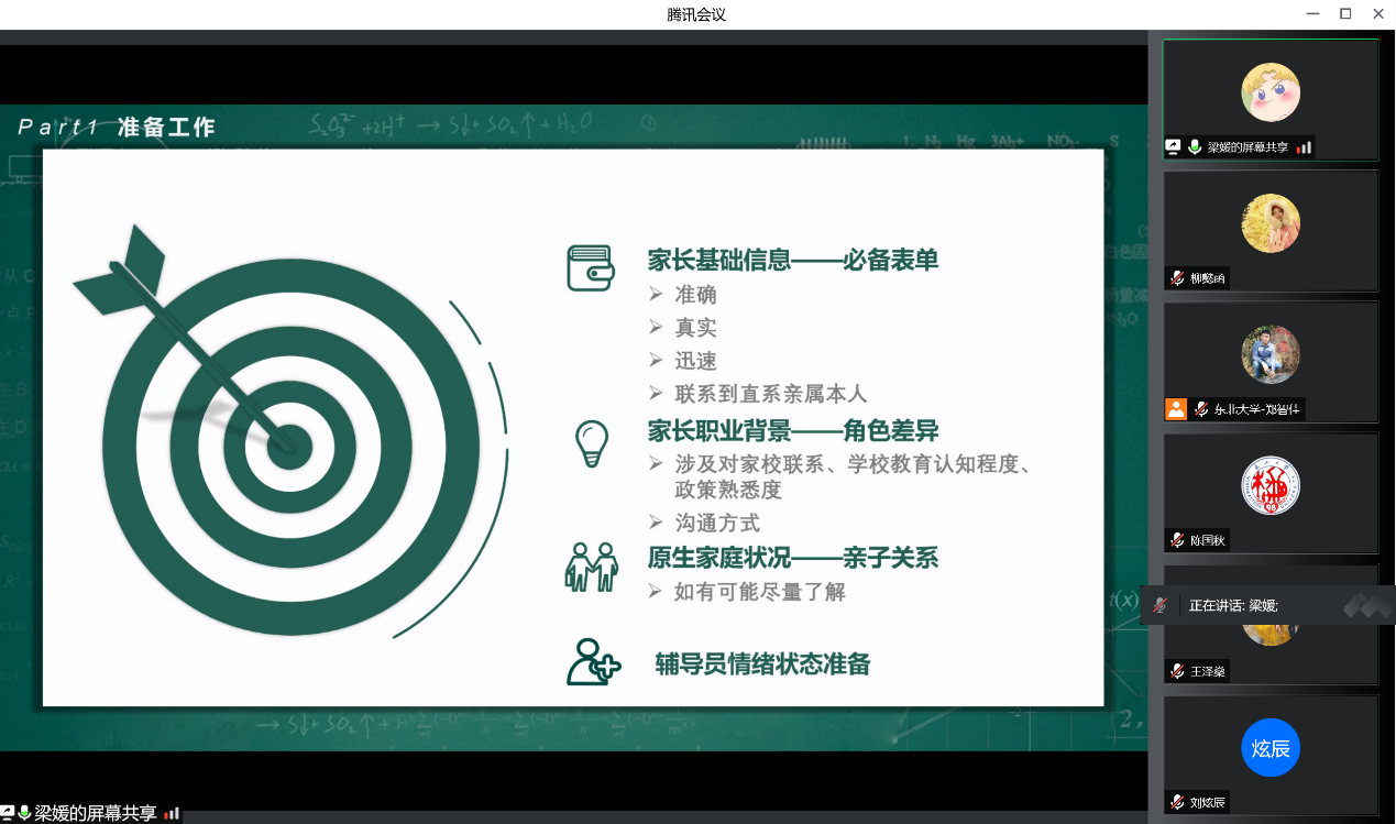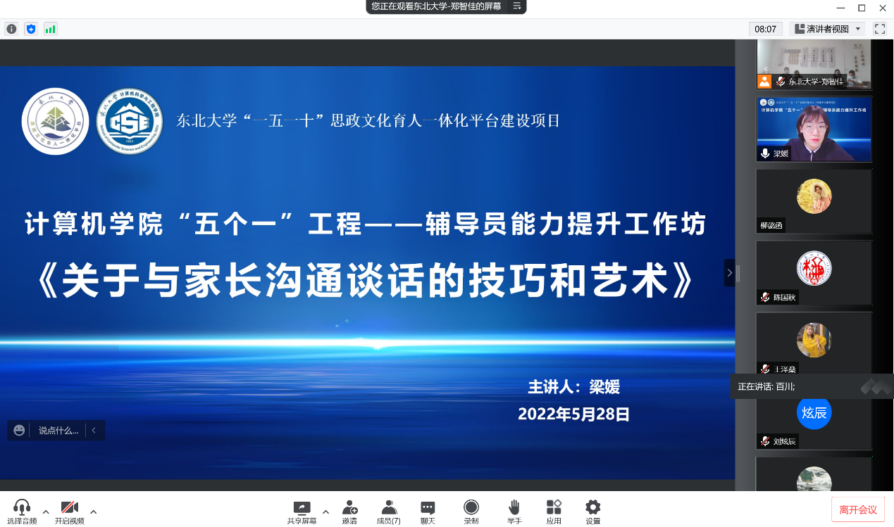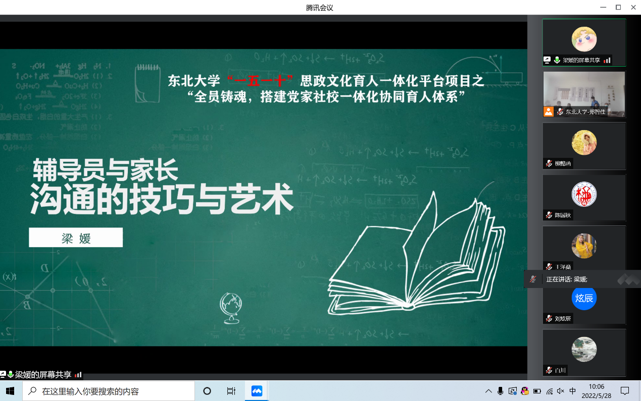 梁媛首先抛出问题“到了大学阶段,我们为什么还要与家长沟通”,并以2021年学院设计发布的《东北大学家校协同育人问卷》调研数据为基础,从减少信息沟通不对等性、形成家校联盟、实现“责任共担、问题共管”良好局面三大目标予以指导。随后,梁媛结合实例与调研数据,从与家长沟通前准备工作、与家长沟通过程主导及应对办法、沟通艺术与技巧三方面展开讲解。她强调,家校联系过程中,应让家长感受到我们想要帮助学生解决问题的诚意,建立信任,如实地陈述学生情况,双向沟通,达成共识。分享结束后,与会人员就主题相关问题展开了深入的交流讨论。