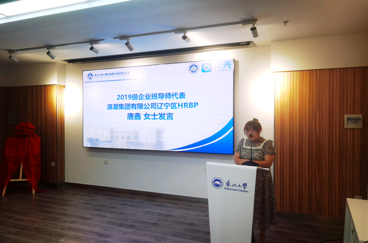 浪潮集团有限公司辽宁区HRBP唐鑫代表2019级全体企业班导师发言,对企业班导师的职责与工作进行深刻阐释,表达了对未来指导过程的美好期望,期待通过夏令营增加对学生的了解,进而调整企业培养方式,深化对学生的就业指导。