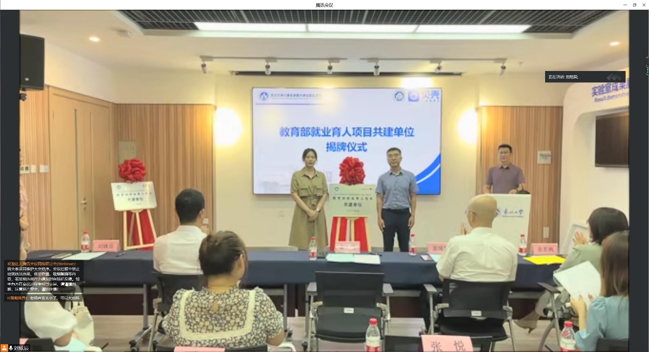 邸馗与教育部就业育人项目共建单位代表共同揭开共建单位的牌匾,并进行致辞。邸馗强调了就业的重要性,肯定了企业班导师在学生就业能力培养方面的突出贡献,介绍了学院一系列对学生生涯发展有积极影响的创新性举措,对参加夏令营的同学们提出“珍惜机会,全心投入”“开拓视野、学习提升”“积极思考、知行合一”三点建议,表达了对校企合作再创新高度的祝愿。最后宣布我院“首届大学生职业发展能力提升夏令营”正式开营。
