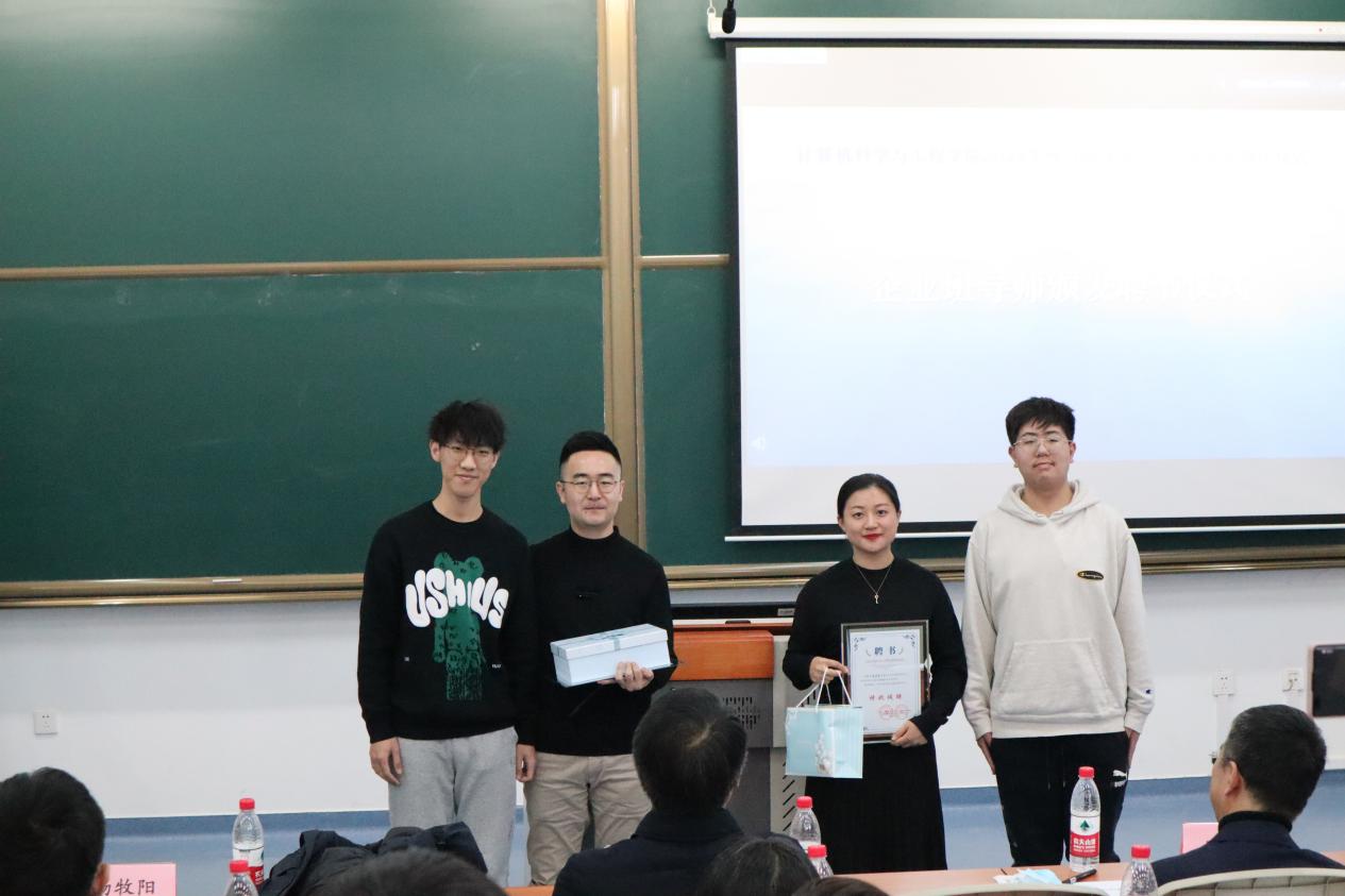 随后,杨金柱宣读《计算机科学与工程学院关于调整2021级本科生班级班导师、在2022级本科生班级配备班导师的通知》《计算机科学与工程学院关于在2021级、2022级本科生班级配备企业班导师的通知》。鲍玉斌、马国强、聂国东为到场的企业班导师及校内班导师颁发聘书,各班级代表为班导师献上亲手制作的“谢师礼”。