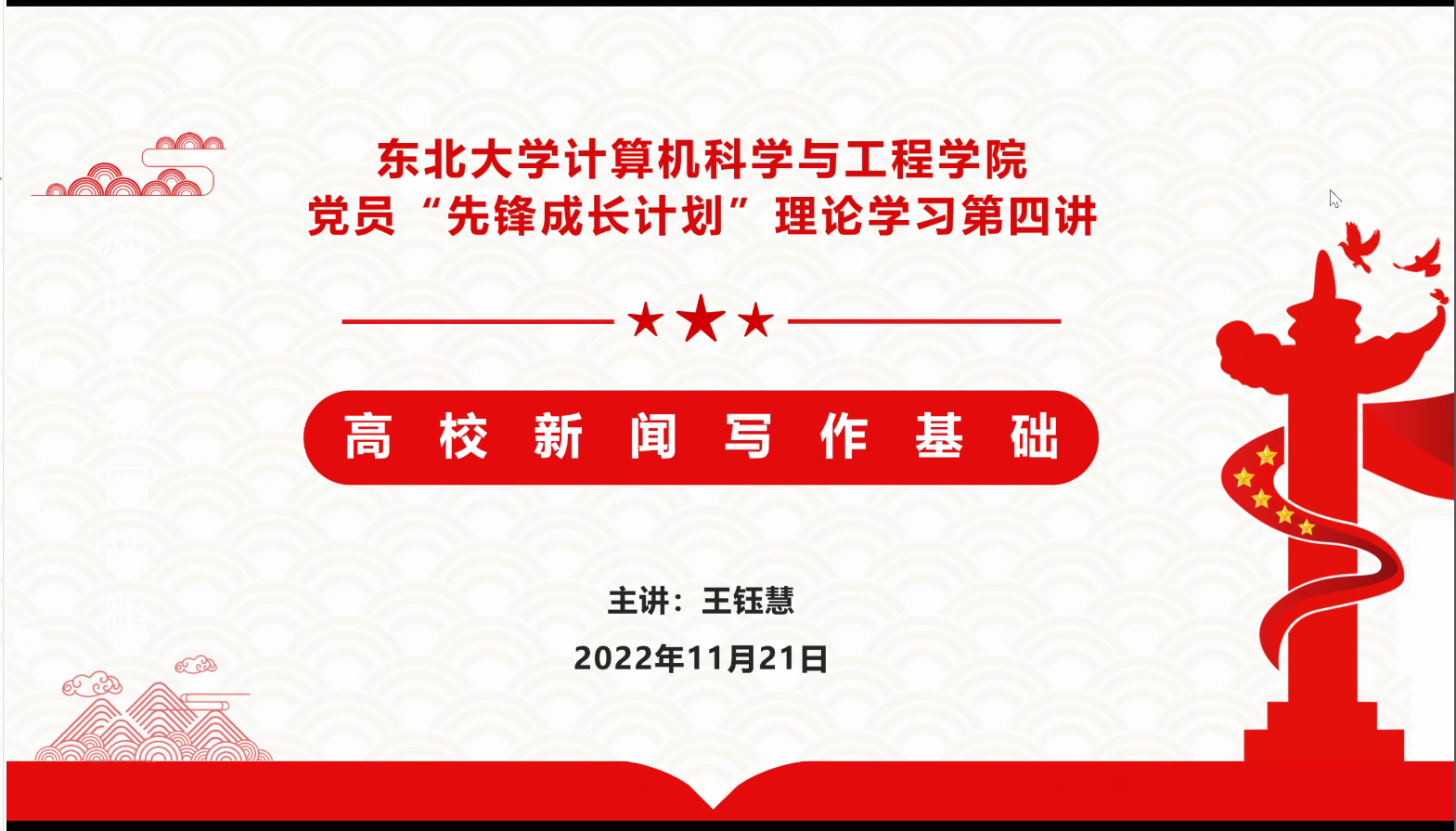 11月21日,我院学生党总支通过腾讯会议方式线上开展了党员“先锋成长计划”理论学习第四讲报告会。此次专题报告会的主题为“高校新闻写作基础”,报告会由校党委宣传部王钰慧老师主讲,共计300余名学生党员参加活动。