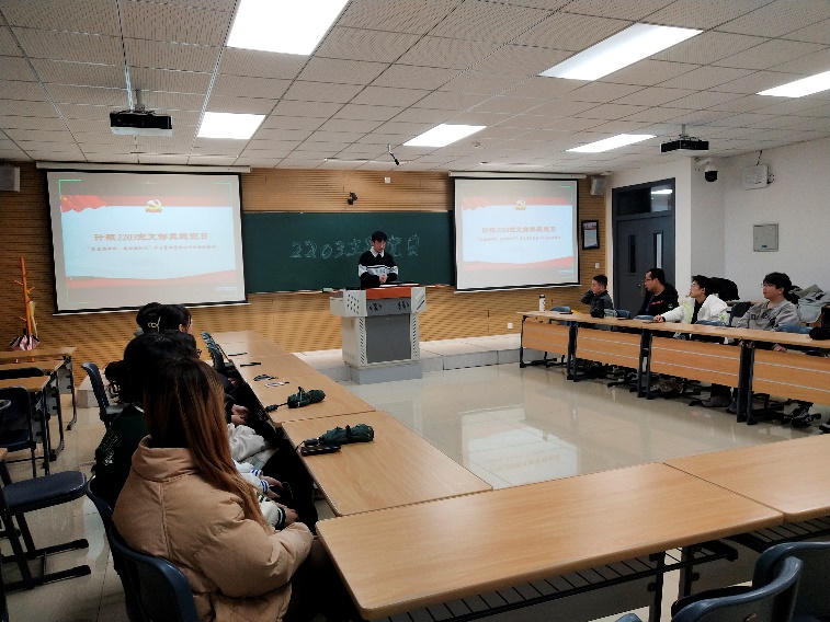 硕士2009党支部由支部书记崔旭旭作为党课主讲人,带领支部党员从坚持和发展马克思主义的指导思想、举什么旗,走什么路的根本问题、以什么样的精神状态踔厉前行、朝着什么样的目标继续前进四个方面进行党的二十大创新理论的学习。硕士2204党支部王亚倩、吴进、吴易嘉同志以“从23组关键词读懂党的二十大报告”为题,对23组关键词逐一讲原文、说解读。硕士2207党支部由支部书记李玉金从大会意义、大会主题、大会要点三个方面进行讲解,重点学习大会实施科教兴国战略、强化现代化建设人才支撑的要点,还采用知识问答的方式充分调动党员的积极性,引导党员进行思考。