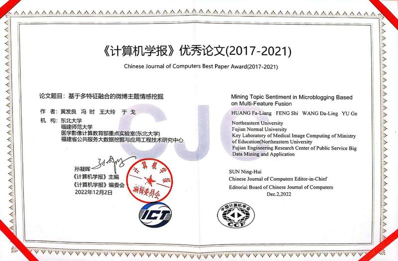 近日,2022中国计算机学会(CCF)年度颁奖典礼在北京举行。我院于戈教授团队发表的论文《基于多特征融合的微博主题情感挖掘》获得《计算机学报》颁发的2017-2021年度优秀论文奖。该论文于2017年4月发表在《计算机学报》上,第一作者是我院黄发良博士后。该论文针对微博消息长度短小、噪音高的特点,提出将情感表情符号与微博用户性格情绪特征纳入到图模型中实现微博主题与情感的同步推导,性能显著优于其它短文本情感分类模型。