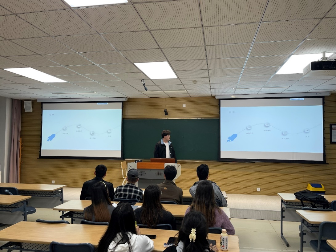 会上,阿布都克玉木·阿布都拉同学从个人经历、学习方法、如何走出迷茫、如何确立目标、如何对懒惰说“不”、保研经验等方面展开详细介绍,并鼓励同学们尽快树立目标、坚定学习信心、提升专业水平。分享结束后,设置自主提问环节,同学们积极提问,现场氛围活跃。