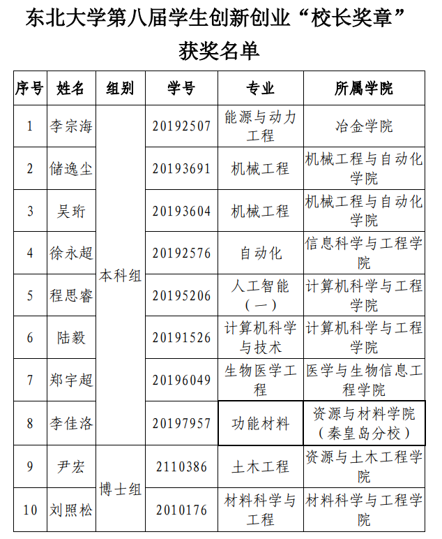 近日,东北大学第八届学生创新创业 “校长奖章”名单公布,我院2019级本科生程思睿、陆毅荣获东北大学第八届学生创新创业“校长奖章”,全校共10名学生获此殊荣。