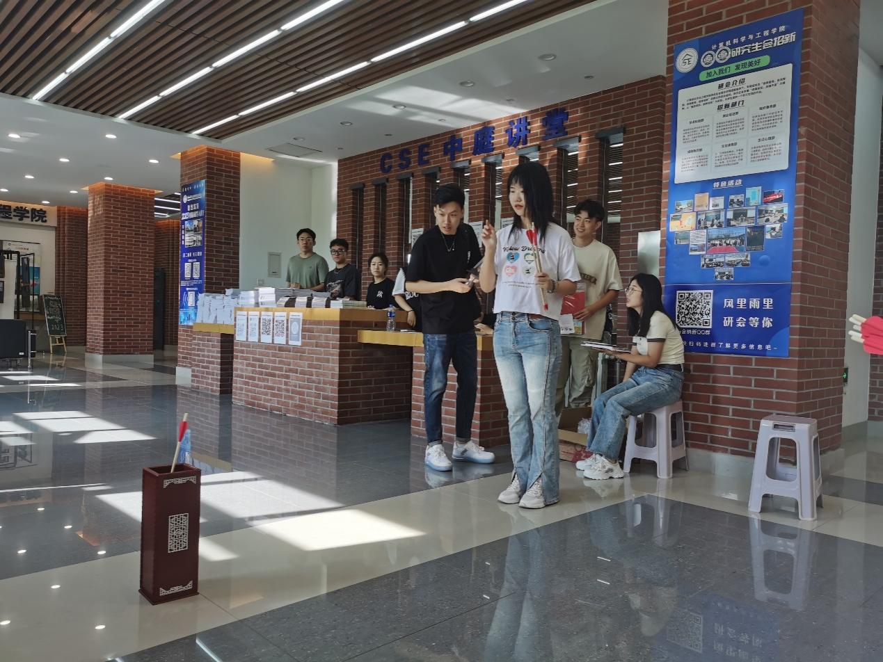 学院注重迎新现场氛围营造,让新生感受到家一般的温暖。制作“百年东大”寄语祝福墙,激发新生爱校荣校热情;设计“锦囊妙计”寝室提示卡,上好新生“校园安全和防骗第一课”;现场展示多国语机器翻译系统及智能影像分析及辅助诊疗等科研团队成果,以生动有趣的现场实操提升新生专业兴趣;设计院训、云小C+专业、建校百年标志系列宣传品,为新生及家长拍照、合影留念,营造现场热烈氛围,增强新生学院归属感。研究生迎新点准备了投壶小游戏,营造活泼欢乐的气氛,并将报到全程通过抖音进行线上直播,为线上的家长们展示现场的热烈氛围,彰显研究生会积极热情的精神风貌。