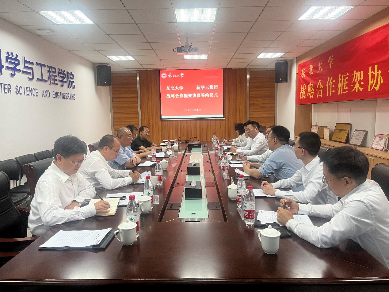 9月13日,东北大学与新华三集团战略合作框架协议签约仪式在浑南校区信息学馆B320会议室举行。紫光计算机科技有限公司董事长兼总裁黄辉华,首席运营官章小伟,新华三集团辽宁代表处总经理赵鹏,产品副总经理鞠永峰,教育医疗行业副总经理高岩,智慧业务首席顾问杨健,教育医疗行业代表宋悦菡,东北大学党委常委、副校长王兴伟,信息化建设与网络安全办公室、计算机学院相关负责人出席签约仪式。签约仪式由计算机学院党委书记邸馗主持。