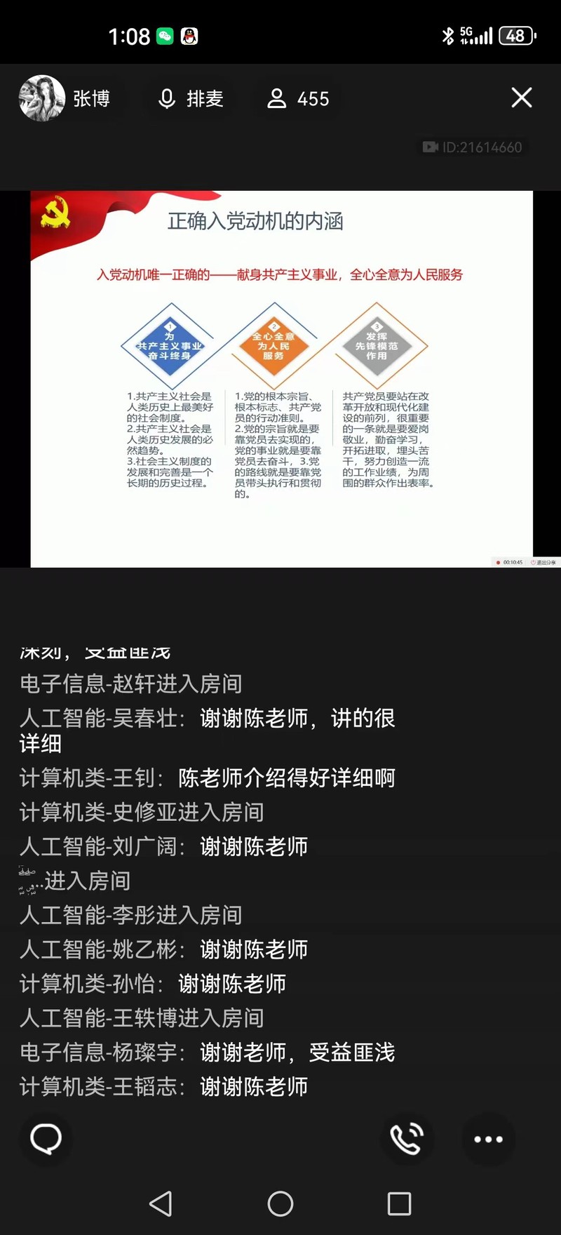 9月13日,2023级本科新生入党“启航计划”第二场专题报告于腾讯会议线上举行,2023级500多名同学同时在线。学院党委组织员陈国秋作了题为“加入中国共产党是青年大学生的正确选择”专题报告会。陈国秋围绕“青年大学生为什么要加入中国共产党”这一核心问题,讲述中国共产党从建立到逐渐发展为伟大、光荣的领导力量这一宏伟征途,以这一光辉灿烂的发展史告诉我们:党的领导是正确的、是历史潮流的必然趋势,加入中国共产党是青年大学生的正确选择。陈国秋还以导图的形式详细地介绍了入党流程以及入党申请书的规范格式、书写方法,让同学们清晰了解了入党流程。此次专题报告会使全体参会同学对党组织有了初步了解,为他们明晰了未来的入党规划,激起了新生入党热情的同时,鼓励2023级500多名新生积极向党组织靠拢,保持对党、对祖国的赤诚热忱。