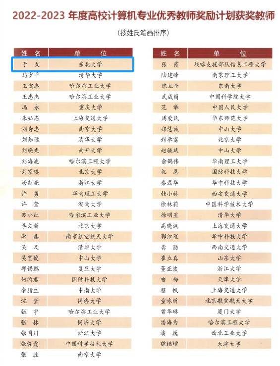 12月2日,第五届中国计算机教育大会在福建举办,会上举行了2022-2023年度“高校计算机专业优秀教师奖励计划”颁奖仪式。55位教师从153名参评者中脱颖而出,东北大学计算机科学与工程学院于戈教授获奖,至此东北大学共有2名教师入选该奖励计划。