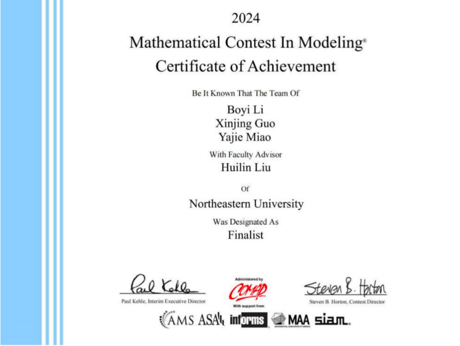 我院教师刘辉林指导的李博益、郭馨靖、苗雅杰团队,教师李大宇指导的万睿俊、宗佳玥、刘佳桐团队分别获得了大赛特等奖提名奖(Finalist)。我院教师吴刚指导的路家祥、杨进、郭恒源团队,教师郎俊指导的关顺天、马国轩、王志豪团队,教师李大宇执导的田正扬、戴莘曦、张益硕团队,教师巩树凤指导的刘飞阳、毛志雄、成泽帅团队,教师张恩德指导的陶冶、方雄飞、郑泽昊团队获得大赛一等奖(Meritorious Winner)。