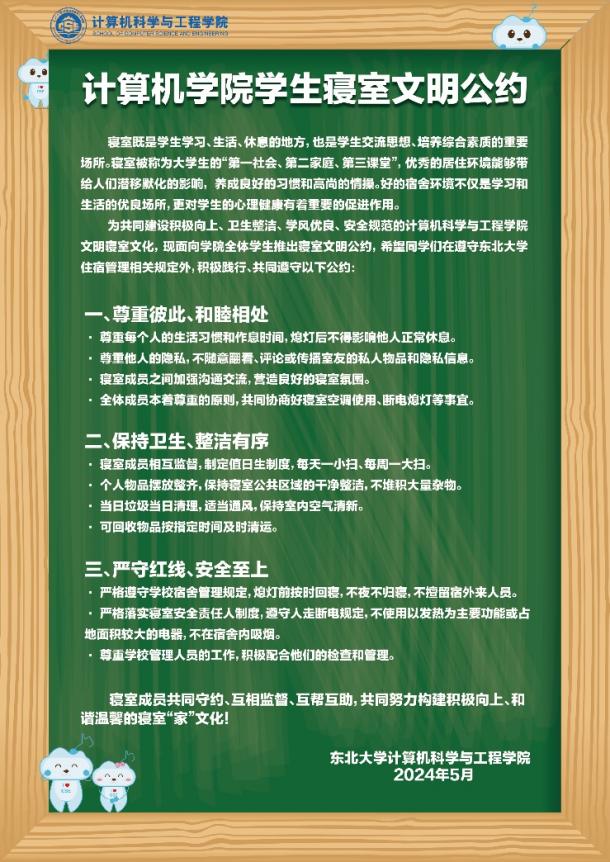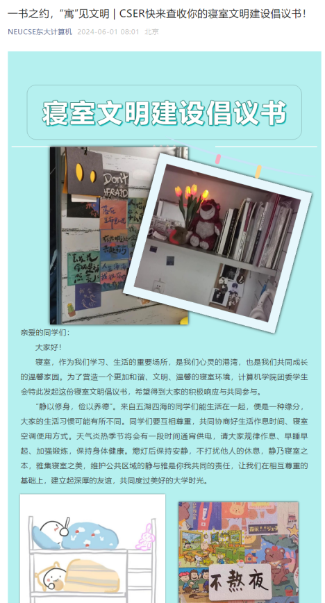 完善制度体系,文明建设“有温度”。学院制定了《计算机学院学生工作干部走访学生寝室工作实施方案》,鼓励学生工作干部深入学生生活,结合走访与谈心谈话,关心学生、发现问题、了解思想,巩固思政教育主阵地,提高教育的精准性和时效性。同时,制定了《寝室文明公约》,推广《寝室文明建设倡议书》,提升学生底线和红线意识,强化契约精神,积极推动寝室文化建设。