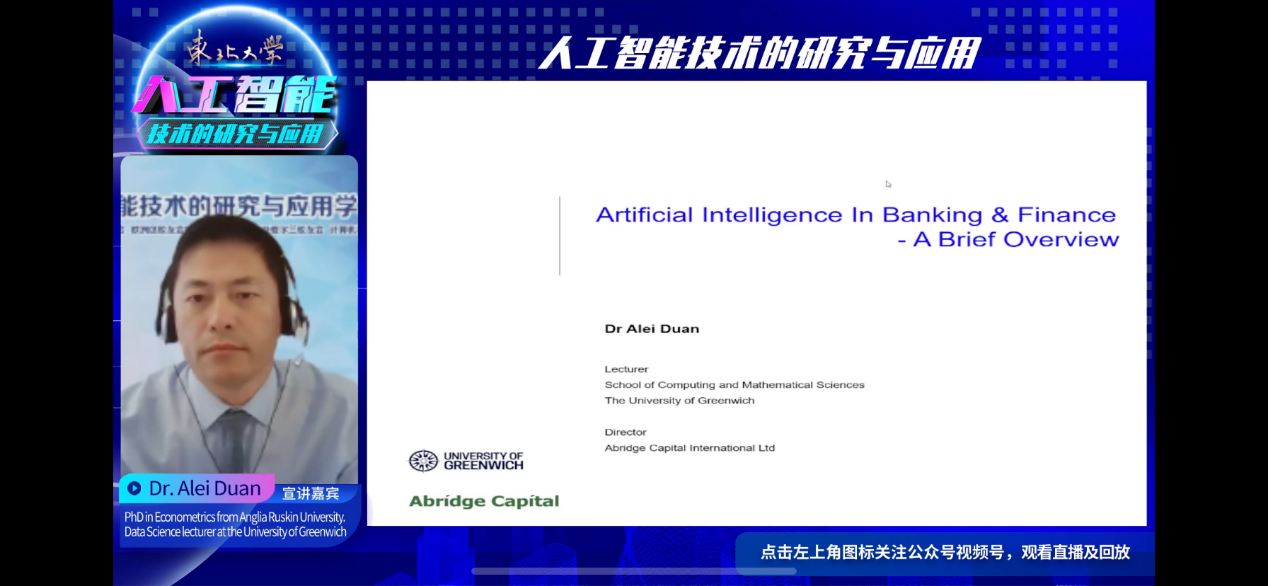 英国校友段阿雷博士作题为“人工智能在金融领域”的主题报告,回顾了人工智能在金融和银行领域的发展趋势及挑战。