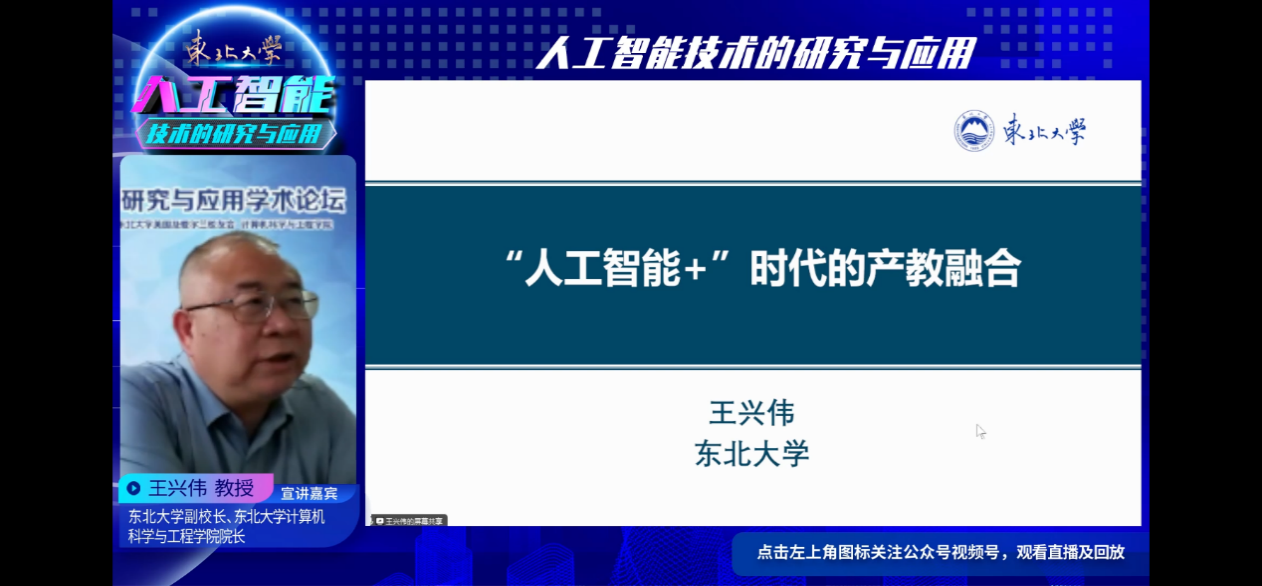 在论坛的学术报告环节,王兴伟教授首先作题为“‘人工智能+’时代的产教融合”主题报告,阐述“人工智能+”时代下的人才培养、科学研究、生产实践新发展。