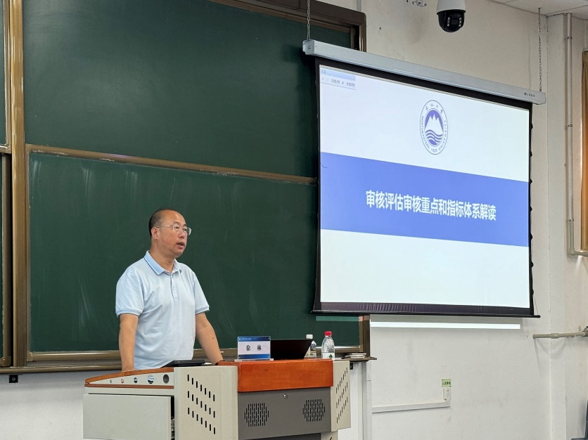 徐林从新时代战略使命、新一轮审核评估对高校的总要求、新一轮审核评估《方案》主要内容和核心用意、第一类审核评估解读、第一轮自查自评工作要求五个方面对审核重点和指标体系进行解读。他强调,本次审核评估既是学校本科教育教学工作的一次全面体检,更是学校立足新阶段、把握新机遇、实现新跨越的重要契机,新一轮本科教育教学审核评估时间紧、任务重,希望学院全体师生要统一思想、提高站位,认真学习审核评估文件,吃透审核评估精神,把握指标内涵,保质保量完成审核评估任务。