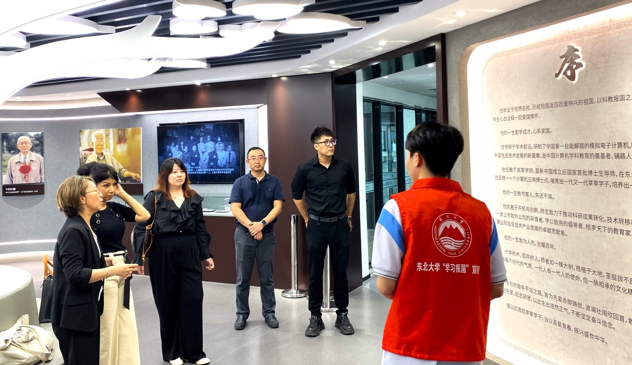 学院党委副书记兼纪委书记李传文邀请外方参观华天馆。Samira KARRACH女士对于李华天教授的光辉事迹颇为动容,对于华天精神赞叹不已。之后双方移步B320会议室,李传文介绍了东北大学建校百年悠久历史、计算机学院的学科发展历程及优势科研方向。