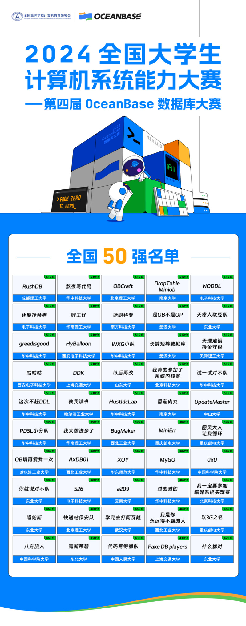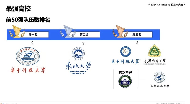 11月11日,2024年OceanBase 数据库大赛初赛阶段顺利结束。我院有五支队伍在全国1212支队伍中脱颖而出进入了全国前50强,成功获得决赛入场券,在全国高校中排名第二。