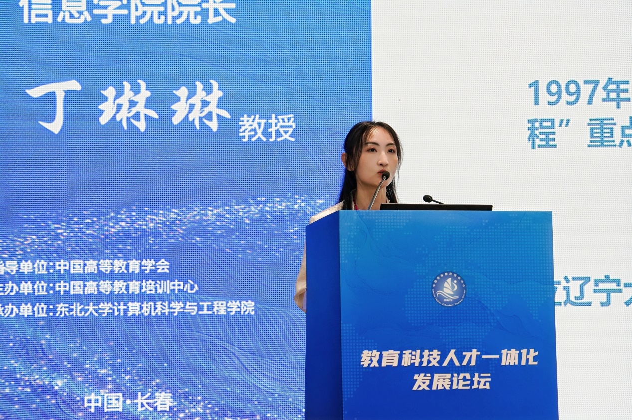 东北大学计算机科学与工程学院副院长宋晓诗以“厚德明理,兼容惟新—东北大学计算机科学与工程学院拔尖创新人才探索与实践”为题,从东北大学计算机学院的发展历程、各专业人才培养体系、实验与实践教学、人工智能赋能教育教学、拔尖创新人才培育五个方面进行了分享。