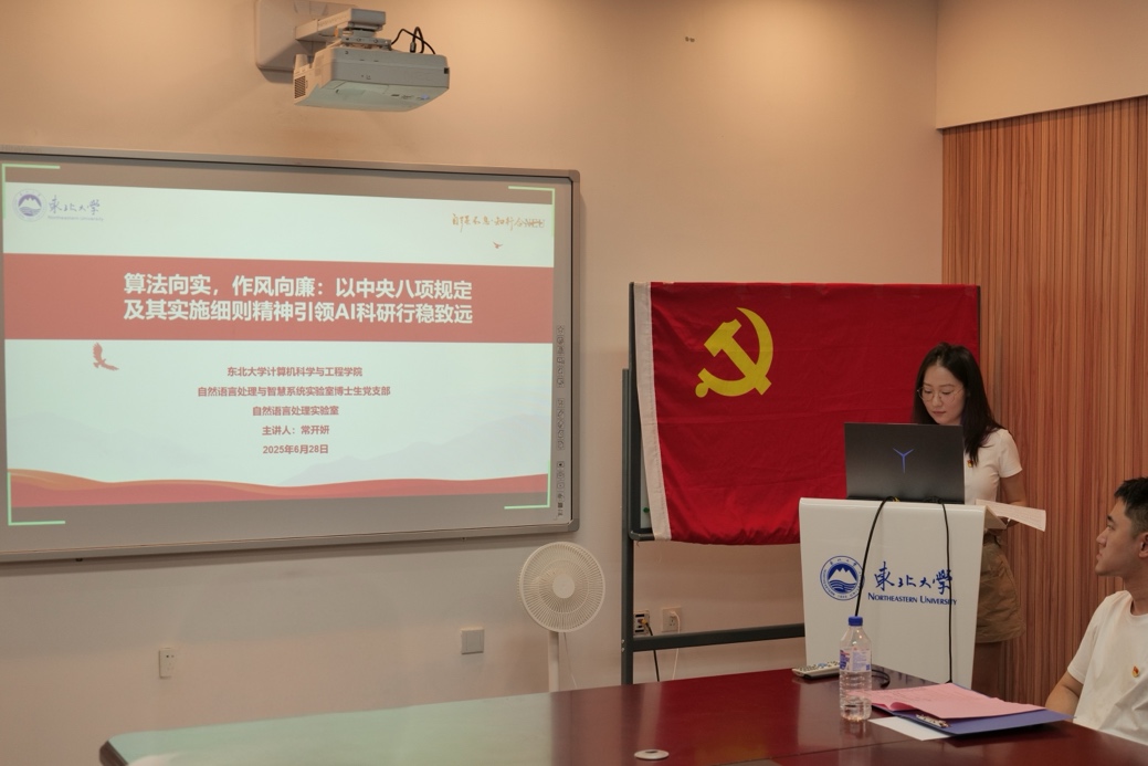 活动开始,张长帅介绍了此次主题党日活动的目的意义,并向与会同志报告了支部基本情况以及自入围学校第三批“党建工作样板支部”培育创建单位以来取得的进展成效。随后,按照学校学习教育工作专班关于党支部书记“七一”前后讲授专题党课要求,以“中央八项规定精神与科研人生”为主题讲授专题党课,阐释中央八项规定及其实施细则精神对博士生党员的教育与指导意义,并号召全体党员要将党性修养融入学术科研追求当中。在党建+科研成果展示环节,党支部宣传委员王鸿菲展示了医学影像AI研究如何服务“健康中国”战略,体现算法研发中的党员担当。支部党员常开妍汇报了团队将NLP技术与党建深度融合的实践成果,以及党员在推进科研创新和破解难题上取得成果成效。在“思想碰撞检视自身”环节,支部党员同志结合科研实践,对照中央八项规定及其实施细则精神开展自我剖析,通过案例研讨深化纪律教育,切实增强深入贯彻的自觉性和坚定性。