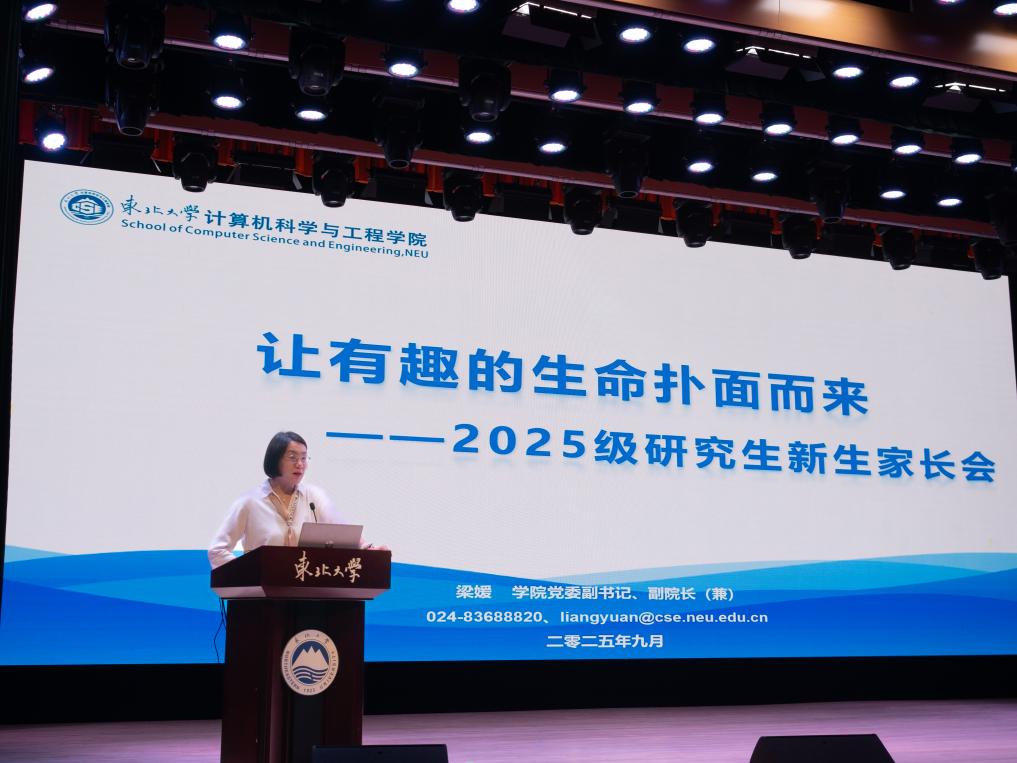 金秋送爽,丹桂飘香。9月1日下午,计算机学院于浑南校区图书馆泰山报告厅隆重举行2025级研究生新生“开学第一课”暨新生家长会。学院通过微信视频号开启同步直播,以“线上+线下”结合的形式,为即将开启研究生生涯的学子指引方向,与家长携手共话成长,助力新生从容迎接未来挑战。学院院长、学院党委副书记、副院长(兼)梁媛、教学科研办公室副主任张力航、学生工作办公室副主任张棹然,以及全体2025级研究生新生参会。会议由2025级硕士研究生辅导员柳懿函主持。