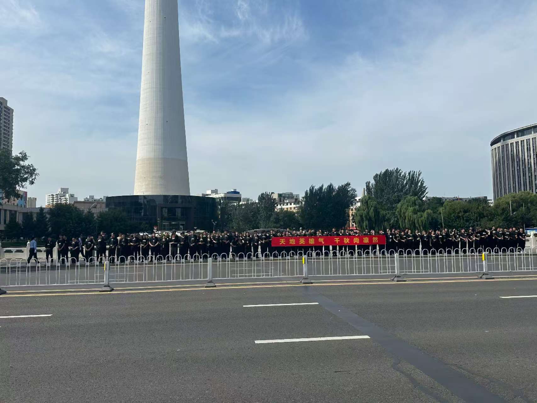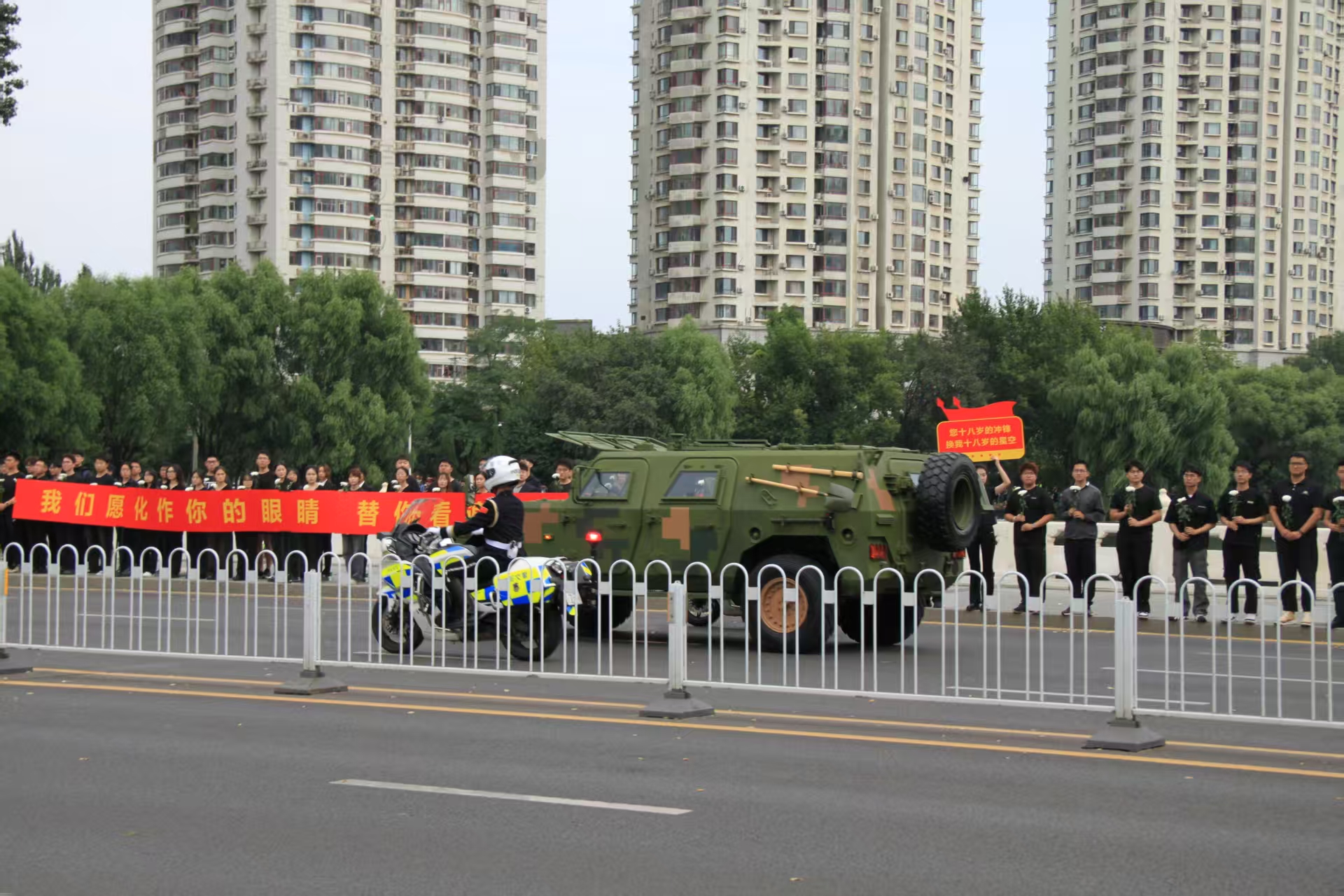 在这场跨越时空的致敬仪式中,计算机学院300余名师生自发来到青年大街沿线,手捧白菊,共擎“天地英雄气 千秋尚凛然”等横幅,目送车队缓缓驶过。烈日之下,白菊寄哀思,师生们神情肃穆,以最朴素的方式表达对英烈的无限敬意。从桃仙国际机场到抗美援朝烈士陵园,这一路,既是英雄的归途,更是民族记忆的深刻印刻。