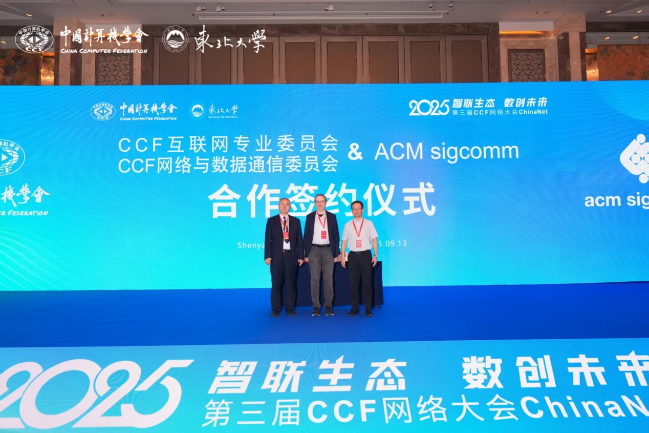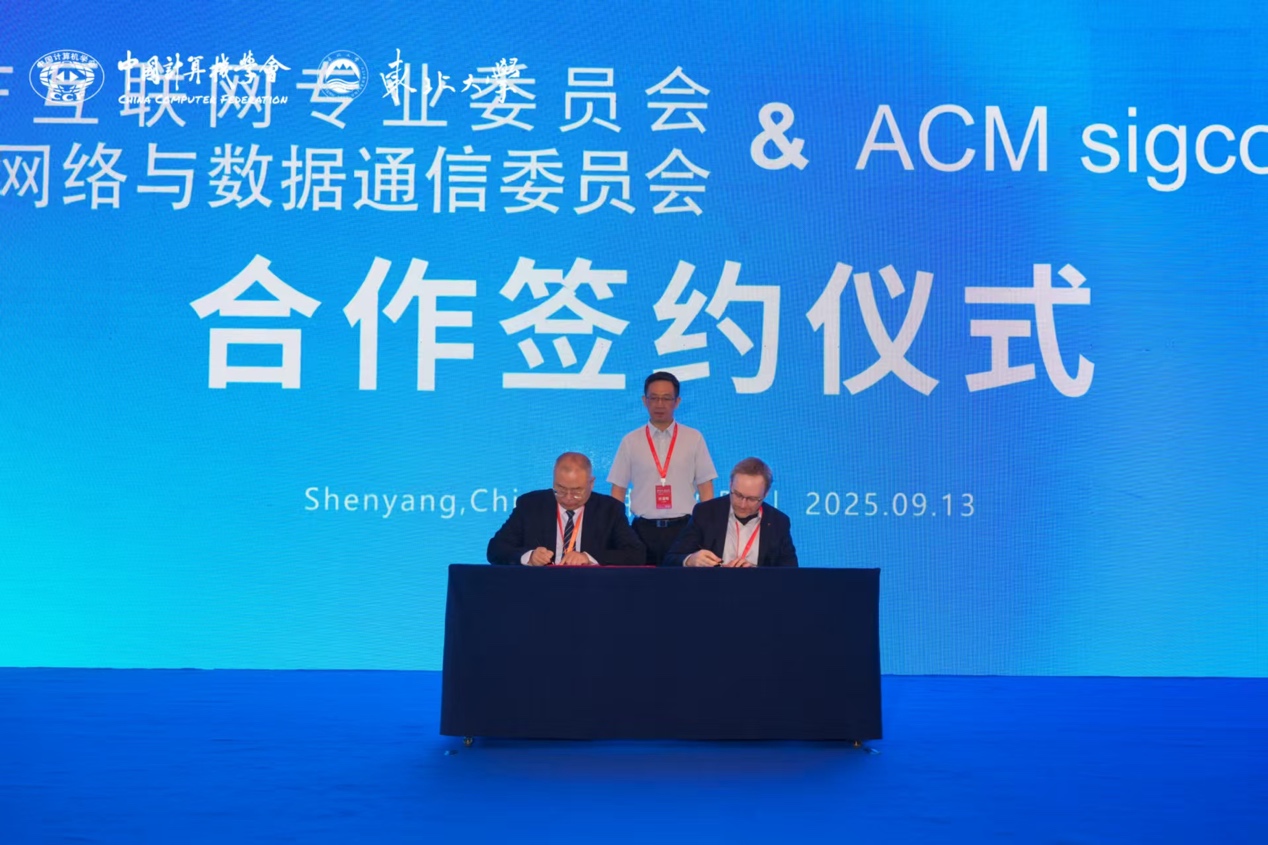 2025年9月13日上午,中国计算机学会CCF互联网专业委员会、网络与数据通信专业委员会与ACM SIGCOMM全面合作签约仪式在CCF网络大会开幕式上隆重举行。CCF互联网专业委员会主任、东北大学党委常委、副校长王兴伟教授与ACM SIGCOMM主席Matthew Caesar教授代表双方完成签约,CCF理事长孙凝晖教授亲临现场见证签约仪式。